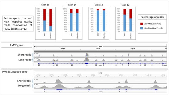 ONT LRS demonstrated superior performance in genomic regions characterized by high sequence homology with pseudogenes, such as exons 12 to 15 of the PMS2 gene. The presence of the highly similar pseudogene PMS2CL poses two major challenges. First, during library preparation and target capture, it is technically difficult to enrich selectively PMS2 exons without co-capturing homologous regions of PMS2CL. Second, during read mapping, the high sequence similarity complicates the assignment of the true genomic origin of the sequenced fragments. These issues result in a high proportion of reads with a low mapping quality, leading to a loss of coverage and hampering accurate variant detection. ONT LRS significantly mitigated these issues. LRS consistently improved the coverage of PMS2 exons 12–15, providing better coverage profiles and reducing the fraction of low-mapping-quality reads compared to SRS (Figure 3). This improvement was pronounced particularly for exons 12 and 15, which are the most affected by pseudogene interference. In these regions, the number of reads with low mapping quality was reduced by approximately 50% with ONT LRS. In the meantime, the correct mapping on PMS2CL allowed for the precise recognition of variants present in PMS2 or PMS2CL.