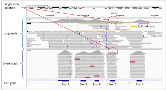 A total of 116 negative samples (VUS and LB/B variants), in which SRS did not identify any P/LP variants, were sequenced using ONT LRS to evaluate whether this approach could detect missed causative variants potentially related to the clinical phenotypes. Among these, 31 samples were sequenced with the CARDIO pro panel, 60 with the HEVA pro panel, and 25 with the BRaCA panel. In none of these cases did ONT identify LP/P variants missed by SRS within the targeted panel genes. An additional set of 12 cases was analyzed with ONT LRS using the ClinEX (n = 4) and WholEX pro (n = 8) panels. Ten of these had previously tested negative by SRS and MLPA, while in two related individuals a heterozygous deletion affecting exon 5 of the ENG gene had been missed by SRS but detected by MLPA. ONT LRS correctly identified the exon 5 deletion in both carriers, which is associated with Osler-Rendu-Weber syndrome 1 (ROS). Upon inspection, it was observed that in SRS data, exon 5 is still captured and partially enriched even in the presence of a deletion, thereby masking the CNV during variant calling. In contrast, ONT sequencing provided a more accurate representation of the true coverage drop caused by the deletion. Furthermore, the presence of split reads spanning the deletion boundaries allowed not only the detection of the CNV but also its precise breakpoint localization (Figure 4).