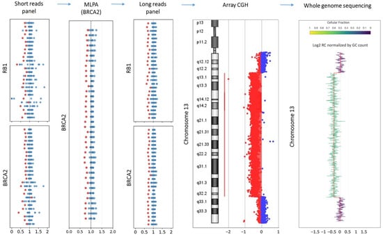 The figure summarizes the findings of multiple genomic technologies targeting chromosome 13. Each dot represents an exon or a probe used to quantify the tested sample (red dots) against control samples (blue dots). The short-read-based panel identified deletions involving both RB1 and BRCA2, with an allelic signal of approximately 0.7 (red) compared to 1.0 in controls (blue), despite an overall low signal quality. MLPA confirmed the complete deletion of BRCA2 and confirmed the allelic imbalance. Long-read sequencing further validated the deletions of both RB1 and BRCA2, offering higher signal resolution compared to short-read sequencing. Array-CGH identified a deletion spanning the 13q region, confirming the presence of the structural variant and supporting the allelic imbalance. The whole-genome sequencing panel presents the log-transformed read count (RC) profile across chromosome 13, normalized for GC content, as processed using the KaryoSolver tool v.1.0 (4Bases SA, Manno, Switzerland).