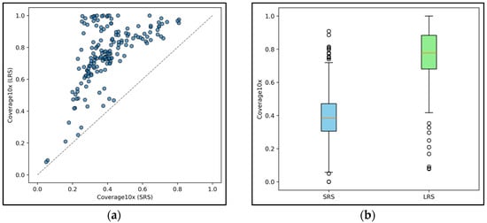 (a) The graph shows the percentage of intronic regions covered by ONT LRS and SRS for each gene included in the CARDIO pro and HEVA pro panels. The dashed diagonal line separates the plot into two zones: genes (represented by the blue circles) plotted above the line exhibit higher intronic coverage with ONT LRS compared to SRS, while genes below the line (none in this dataset) indicate better coverage with SRS. (b) The graph shows the distribution of aggregated intronic coverage across ONT LRS and SRS samples. White circles represent outliers.