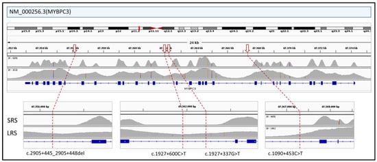 Interrogation of ClinVar (https://www.ncbi.nlm.nih.gov/clinvar/ (accessed on 26 April 2025)) identified 44 pathogenic deep intronic variants within genes included in the HEVA pro panel and 50 within the CARDIO pro panel (see Supplementary Table S5 for the full list). In ONT-sequenced samples, 70 of these variants were located in regions with coverage exceeding 10×, which has been defined as the threshold for reliable variant detection. Key example in MYBPC3 gene is shown in Figure 7. In addition, 10 variants had sub-threshold coverage, and 14 were not covered at all. In contrast, SRS provided sufficient coverage for only 23 variants, with one below the threshold and 70 entirely lacking coverage.