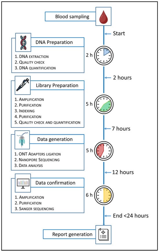 This figure shows the workflow of the fast-track protocol with the specification of the operative steps and their duration from blood sampling to report generation. The fast-track protocol was optimized using the amplicon-based BRaCA panel.