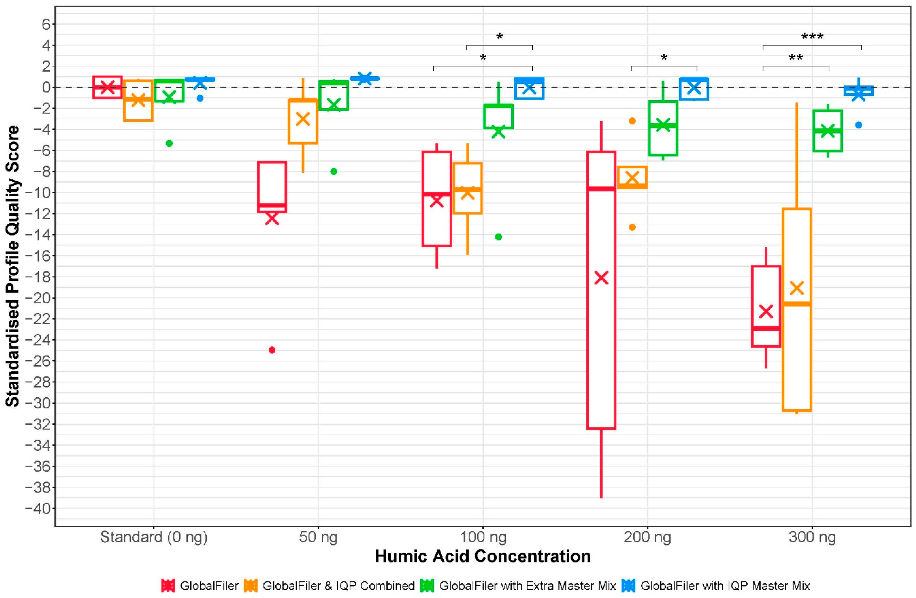 Table 8). As a result, the standard GlobalFiler profiles obtained substantially harsher penalties during scoring and had much lower profile quality scores than all three modified setups. When the 100, 200 and 300 ng profiles were standardised against the standard GlobalFiler (0 ng humic acid) profiles, they were found to not be significantly different in quality to a standard uninhibited GlobalFiler profiles. Importantly, standardisation also indicated that the profiles produced using the GlobalFiler setups with additional polymerase and buffer (either the extra GlobalFiler master mix or Investigator Quantiplex Pro reaction mix) were of significantly greater quality than the standard GlobalFiler setup at the same concentration of inhibitor.
