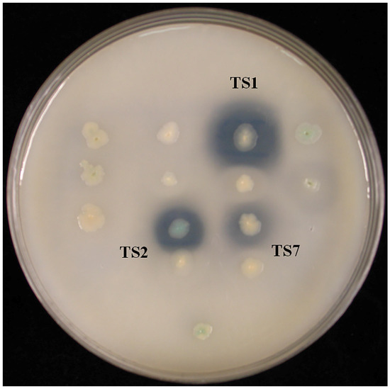 Chromosomal DNA from L. sacchari HS49-1 was sheared to generate 1–4 kb fragments and used to construct a genomic shotgun library. Transformants were plated on LB agar containing 1% triolein and screened for esterase activity based on clear-zone formation. Three clones—TS1, TS2 and TS7—displayed pronounced esterase activity (Figure 2). Notably, the TS1 clone produced the largest clear zone, indicating the strongest esterase activity among the three positive isolates. These three clones were selected for further DNA sequencing analysis. The results revealed open reading frames encoding proteins of 284, 523 and 537 amino acids, designated Est1, Est2 and Est7, respectively. Phylogenetic comparison with characterized esterase families placed Est1 in family VIII, while Est2 and Est7 clustered within family XII (Figure 3).