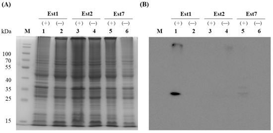 Overexpression of recombinant Est1, Est2, and Est7 in E. coli C43(DE3). (A) Coomassie blue-stained SDS-PAGE gel showing esterase proteins from soluble cell-free extracts, with lanes 1, 3, and 5 representing samples induced with 0.5 mM IPTG (+) and lanes 2, 4, and 6 representing uninduced controls (−). (B) Western blot analysis of esterase proteins from soluble cell-free extracts, with lanes 1, 3, and 5 corresponding to 0.5 mM IPTG-induced samples (+) and lanes 2, 4, and 6 to uninduced controls (−). M indicates the protein marker.