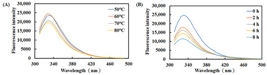 According to the intrinsic fluorescence of tryptophan, tyrosine, and phenylalanine, we examined how temperature and incubation time affected the tertiary structure of recombinant Est1. The native enzyme exhibited an average maximum emission wavelength of 328–331 nm (Figure 10). Pre-incubation at 50 °C or 60 °C for 1 h left the fluorescence spectrum unchanged, indicating preserved conformation. Raising the temperature to 70 °C or 80 °C reduced the fluorescence intensity by only 12.1% and 16.6%, respectively, revealing modest short-term perturbations. To assess long-term thermal stress, recombinant Est1 was pre-treated at 80 °C for 0–8 h. Fluorescence measurements revealed a gradual decline in intensity, ultimately reaching a 53% reduction after 8 h of observation. This pronounced quenching demonstrates that prolonged high-temperature exposure substantially disrupts the protein structure.