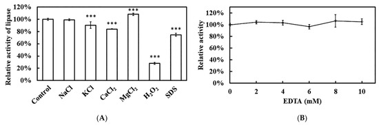 Effect of various reagents on Est1 activity. (A) Different reagents (50 mM NaCl, KCl, CaCl2, MgCl2; 0.1% H2O2, and SDS) and (B) EDTA (0–10 mM) were added to assess Est1 activity at 60 °C for 15 min. Residual enzyme activity was determined via absorbance analysis at 405 nm. *** indicates a significant difference compared with the control group.