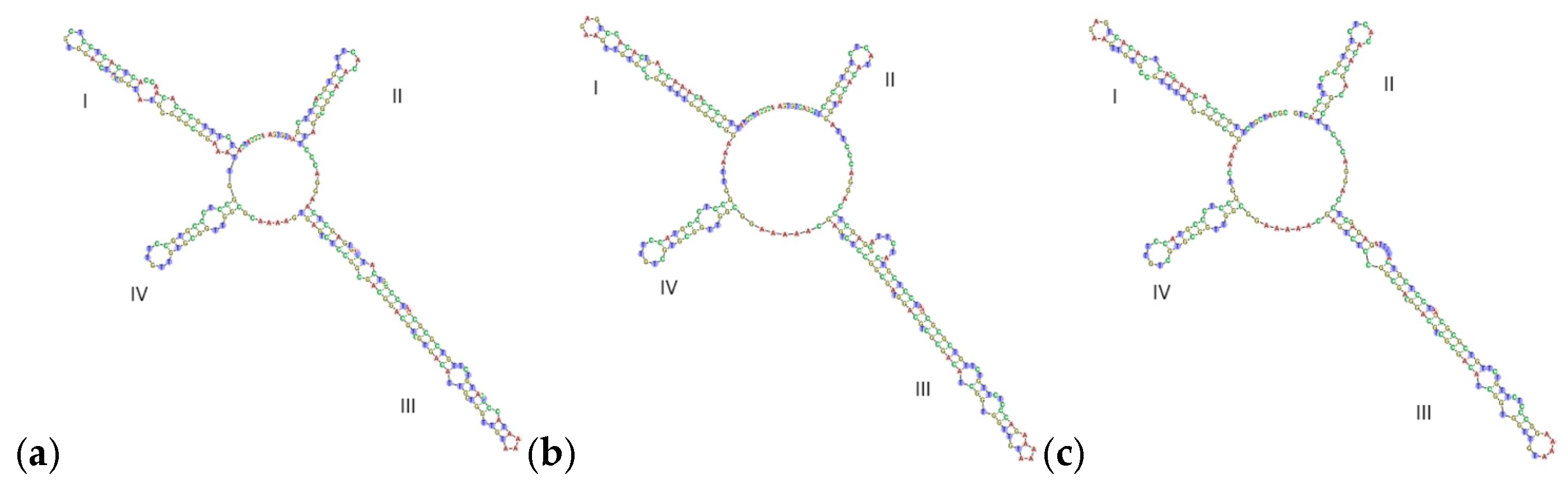 Figure 5. The secondary structures of internal transcribed spacer 2 region: (a) ASR; (b) APR; (c) LPR.