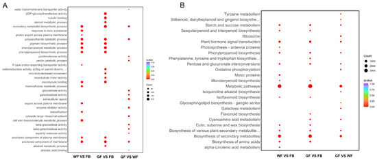 Figure 2. The GO and KEGG enrichment analyses of DEGs at different floral developmental stages of L. macranthoides: (A) GO enrichment plots of DEGs. (B) KEGG enrichment plots of DEGs. FB: flower bud; WF: white flower bud; GF: golden flower bud. In group comparisons, the group before “vs.” is the comparison group, and the group after “vs.” is the control group.