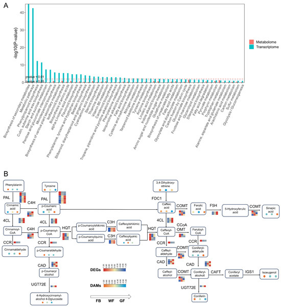 Figure 4. Integrated analysis of DEGs and DAMs in the phenylpropanoid biosynthesis pathway: (A) Bar charts of KEGG enrichment analysis for co-enriched KEGG pathways from transcriptome and metabolome. (B) Heatmaps of DEGs and DAMs in the phenylpropanoid biosynthesis pathway.
