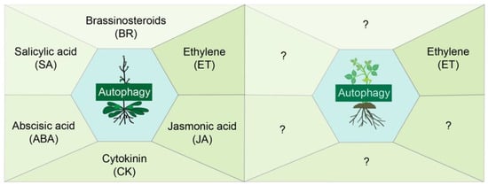 In response to rapidly fluctuating environments, eukaryotes have evolved diverse mechanisms to preserve cellular homeostasis, facilitate nutrient recycling, and conduct quality control of cellular components under both basal and stressful conditions. Autophagy represents a highly conserved catabolic process that plays vital roles in plant growth, development, and stress adaptation []. Notably, phytohormones also serve as central regulators of many of these physiological and stress-responsive processes []. Accumulating experimental evidence underscores an intimate crosstalk between autophagy and phytohormone signaling cascades, and the underpinning molecular mechanisms governing these interactive pathways have started to be unraveled. In additon, the nuclear events involved in the regulation of plant autophagy have been emerged []. Here, we review recent advances in our understanding of how hormones, transcription factors, and epigenetic modifiers regulate the activity of autophagy in Arabidopsis and legumes.