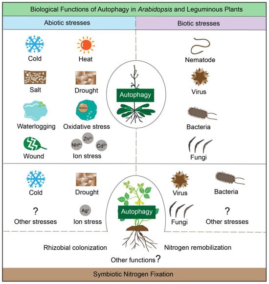 Autophagy serves as a key regulatory mechanism for orchestrating adaptation to diverse abiotic and biotic stresses in Arabidopsis, specifically including nitrogen starvation [], cold damage [], heat stress [,,], salt stress [], drought [,], waterlogging stress [], oxidative stress [], wounding [], cadmium stress [], ammonium stress [], zinc stress [], nematode [], virus, such as Turnip mosaic virus [] and Cauliflower mosaic virus [], bacteria, such as Pseudomonas syringae [], and pathogen, such as Alternaria brassicicola [,], B. cinerea [], Diplodia cupreessi [], Golovinomyces cichoracearum [,], Sclerotinia sclerotiorum [], Verticillium dahliae []. Research on autophagy in leguminous plants remains relatively scarce. Therefore, given legumes’ global importance in food security and sustainable agriculture, deciphering their autophagic regulation could inform strategies to enhance stress tolerance, optimize nitrogen use efficiency, and prolong nodule functionality, thereby addressing pressing challenges in crop improvement and ecological sustainability. Thus, legume autophagy research bridges fundamental cell biology with applied agricultural science, offering unique insights that transcend species-specific studies and advance the broader field of plant stress physiology and symbiosis (Figure 2).