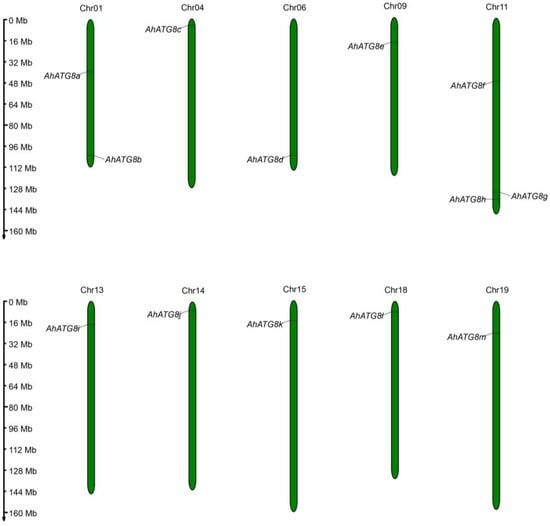 The chromosome distribution of AhATG8 family genes in A. hypogaea. The AhATG8s sequences data derived from the PeanutBase (13 October 2025, https://www.peanutbase.org, A. hypogaea Tifrunner Tifrunner.gnm1.ann1.CCJH Annotations) with default parameters. This image was generated with MG2C v2.1 (http://mg2c.iask.in/mg2c_v2.1/index.html, accessed on 15 October 2025).