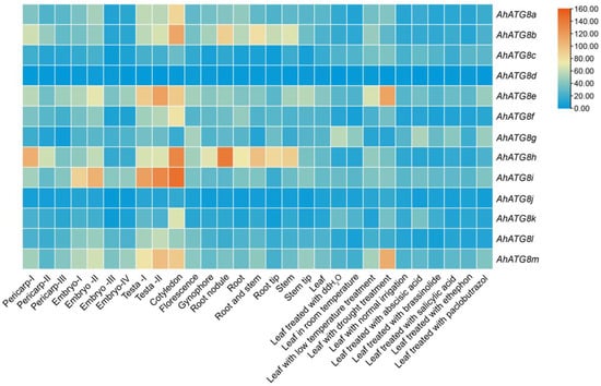 Expression profile of AhATGs genes of A. hypogaea in different tissues and treatments. Transcriptome data regarding the expression levels (Normalized expression values in FPKM) of all AhATG8 members across 29 different peanut tissues and treatments were obtained from the PeanutGenomeResource website (http://peanutgr.fafu.edu.cn/Transcriptome.php#results, accessed on 15 October 2025). The heatmap was generated using the HeatMap function in TBtools v2.152 software, log scale (base = 2 and logwith = 1).