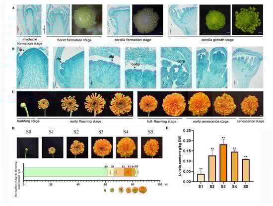 The developmental stages of marigold flower organs and the determination of lutein content. (A,B) Observation of flower buds at different developmental stages of marigold by a stereomicroscope and paraffin cross-section. ip: inflorescence primordium; rfp: ray floret primordium; dfp: disk floret primordium; codp: corolla primordium of disk floret; corp: corolla primordium of ray floret. Bars = 100 μm. (C) Morphological observation of flower buds at different developmental stages of marigold. Bars = 1 cm. (D) The time of different developmental stages of marigold. (E) Lutein content in marigolds at different developmental stages. Three independent experiments were performed, and error bars indicate standard deviations. Significant differences were determined by t-test (** p < 0.01).