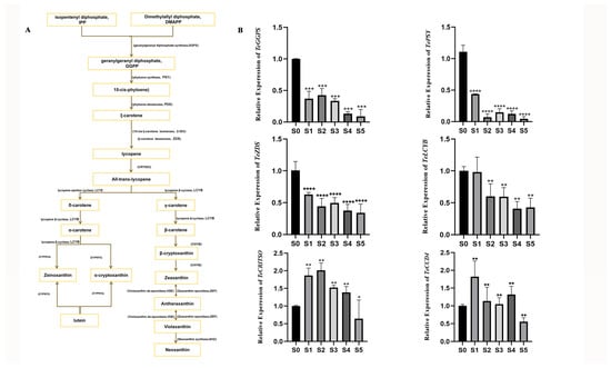 Expression patterns of key genes in the lutein synthesis pathway were detected across different developmental stages of mariglod. (A) Marigold lutein metabolic pathway. (B) Three independent experiments were performed, and error bars indicate standard deviations. Significant differences were determined by t-test (* p < 0.1; ** p < 0.01; *** p < 0.001; **** p < 0.0001).