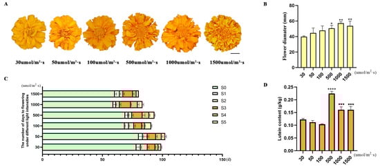 The phenotypes and lutein content of marigolds under different light intensity treatments. (A) Flower morphology observation of marigold at S3 stage under different light conditions; Bars = 1 cm. (B) Flower diameter of marigold at S3 stage under different light conditions; Significant differences were determined by t-test (* p < 0.05; ** p < 0.01). (C) The flowering time of marigold under different light conditions; (D) Lutein content in petals of marigold at S3 stage under different light conditions; Three independent experiments were performed, and error bars indicate standard deviations. Significant differences were determined by t-test (*** p < 0.001; **** p < 0.0001).