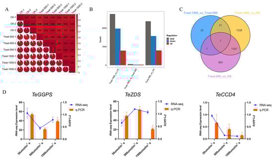 Using low light conditions as the control, we established three comparison groups: CK vs. Treat500, CK vs. Treat1500, and Treat500 vs. Treat1500. These comparisons identified 2371 (1574 up-regulated and 797 down-regulated), 2763 (1975 up-regulated and 788 down-regulated), and 60 (31 up-regulated and 29 down-regulated) differentially expressed genes (DEGs), respectively. The CK vs. Treat1500 comparison exhibited the highest number of DEGs, whereas very few DEGs appeared between Treat500 and Treat1500. In all comparisons, the number of up-regulated genes surpassed that of down-regulated genes (Figure 4B). Among the three groups, 960, 1338, and 25 DEGs were unique to each comparison, respectively. Because the Treat500 vs. Treat1500 group contained so few DEGs, only 7 were common to all three comparisons. These 7 conserved DEGs were primarily associated with molecular chaperones, specifically the small heat-shock proteins Hsp26 and Hsp42 (Figure 4C). Combined with the floral phenotypes observed under different light conditions, substantial phenotypic differences and considerable variations in lutein content were evident between low and high light intensities. The transcriptome data, reflected in the number of DEGs, further confirmed that phenotypic differences between 500 μmol/m2·s and 1500 μmol/m2·s were minimal. To further validate the reliability of the transcriptome data, we analyzed key genes in the lutein biosynthesis pathway using Real-time fluorescence quantitative PCR (qRT-PCR). As shown in Figure 4D, the expression trends from the transcriptome data aligned with those from qRT-PCR, confirming the reliability of the transcriptome data.