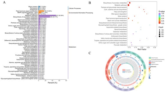To explore the physiological mechanisms of lutein accumulation in marigold petals under varying light conditions, we performed KEGG analysis on the identified differentially expressed genes (DEGs). These DEGs were annotated to pathways involved in Cellular Processes, Environmental Information Processing, and Metabolism. As illustrated in Figure 5A, most DEGs were enriched within Metabolism in Metabolic pathways and Biosynthesis of secondary metabolites, and within Environmental Information Processing in Plant hormone signal transduction and MAPK signaling pathway—plant. Significant enrichment was particularly evident in Metabolic pathways, Biosynthesis of secondary metabolites, and Plant hormone signal transduction (Figure 5B). In the KEGG enrichment circle plot, five categories related to metabolic pathways showed significant enrichment. Among these, Metabolic pathways and Biosynthesis of secondary metabolites contained the highest numbers of background genes, with 4269 and 2543 entries, respectively (Figure 5C). Both the Metabolic pathways and the Biosynthesis of secondary metabolites pathways also incorporated the carotenoid biosynthesis and zeatin biosynthesis pathways (Supplementary Figures S2 and S3).
