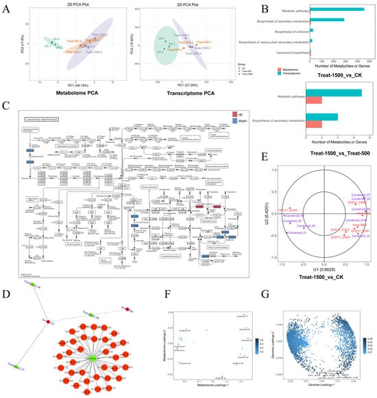 Transcriptional and metabolic joint analysis diagram. (A) Principal Component Analysis (PCA) of the transcriptome and metabolome; (B) KEGG enrichment analysis bar chart; (C) KEGG pathway diagrams co-mapped by differential metabolites and differential genes (Carotenoid biosynthesis pathway); (D) Network diagram of metabolite—gene correlations; (E) canonical correlation analysis; (F) O2PLS analysis of metabolite loadings plot; (G) O2PLS analysis of gene loadings plot.