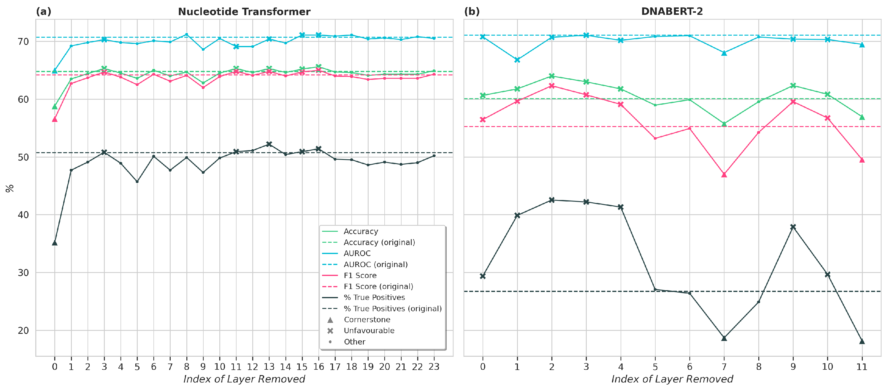 31]. While technical constraints prevented the use of the state-of-the-art model for this problem, the results suggest that distinct cornerstone and unfavourable layers are likely to exist across genomic language models with multiple encoder layers. Future research will investigate the application of structured pruning techniques to state-of-the-art models to determine whether targeted layer optimisation can yield further performance improvement.