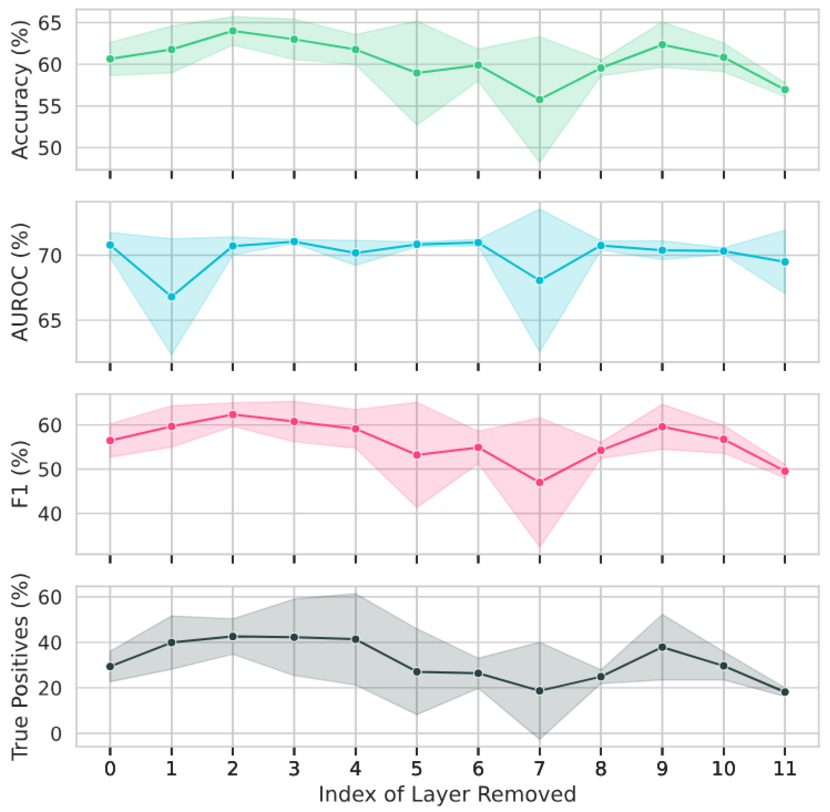 For both models investigated, multiple layers were identified which, when removed, resulted in similar or better performance on the evaluation task; these were termed “unfavourable“ layers. When versions of the models with all unfavourable layers were fine-tuned, their performance on the evaluation task in fact improved, while the training and evaluation times were significantly reduced. This improvement in results with layer removal suggests the existence of redundancy within the removed layers. Such behaviour has previously been observed in similar experiments on LLMs for natural language processing [