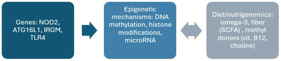 Inflammatory bowel disease results from a complex interaction of genetic, epigenetic, and environmental factors, including diet. Mutations in the NOD2, ATG16L1, IRGM, TLR4, and IL23R genes affect immune function and interactions with the gut microbiota. Epigenetic changes, including DNA methylation, histone modifications, and microRNA expression, can modulate immune responses. Selected dietary components play a key role in modulating gene expression and epigenetic mechanisms, e.g., omega-3 fatty acids, fibre, and methyl donors, leading to the maintenance of intestinal barrier homeostasis. Understanding the interrelationships between these mechanisms creates opportunities for the development of more precise therapeutic and preventive strategies in the treatment of inflammatory bowel diseases (Figure 1).