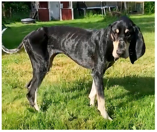 The proband was an intact purebred female PBDG (Figure 2) that was acquired at 8 weeks of age by the owners from a PBDG breeder. The dog received routine vaccinations and at the time of adoption did not exhibit any health issues other than several persistent deciduous teeth; these were surgically removed. Starting at approximately 5 months of age, the proband exhibited intermittent brief episodes of head bobbing. At 12 months the proband developed a pronounced loss of appetite and by 18 months became quite emaciated. She became resistant to walking outside during this period. The inappetence was reversed with a short course of oral administration of omeprazole, although the proband’s muscles remained atrophic despite eating a sufficient amount of dry food. A complete blood chemistry analysis did not identify any abnormalities at this time. Over the following months, the proband developed hind-limb weakness, behavioral signs that included anxiety and hallucinatory episodes, lip smacking, and progressive vision loss, initially only in dim light but progressing to include visual impairment in bright light conditions. The dog became progressively more ataxic and intolerant of grooming or handling.