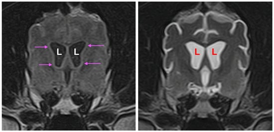 Transverse FLAIR image showing hyperintense areas (arrows) surrounding the enlarged lateral ventricles (L) (left). Transverse T2-weighted image at the same level (right) for comparison that this subtle finding can be difficult to appreciate without FLAIR imaging.