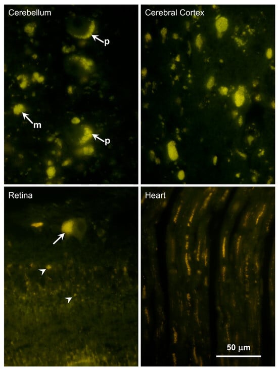- Dowson, J.H. Autofluorescence Emission Spectra of Neuronal Lipopigment in a Case of Adult-Onset Ceroidosis (Kufs’ Disease). Acta Neuropathol. 1983, 59, 241–245. [Google Scholar] [CrossRef]