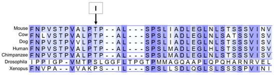 AP3B1 amino acid sequence alignments for multiple species surrounding residue 832 in the canine reference sequence (arrow). In all mammalian species the residue at this position is threonine, whereas isoleucine is predicted at this position in the proband. The amino acid sequences of Drosophila and Xenopus differ significantly from the mammalian sequences.
