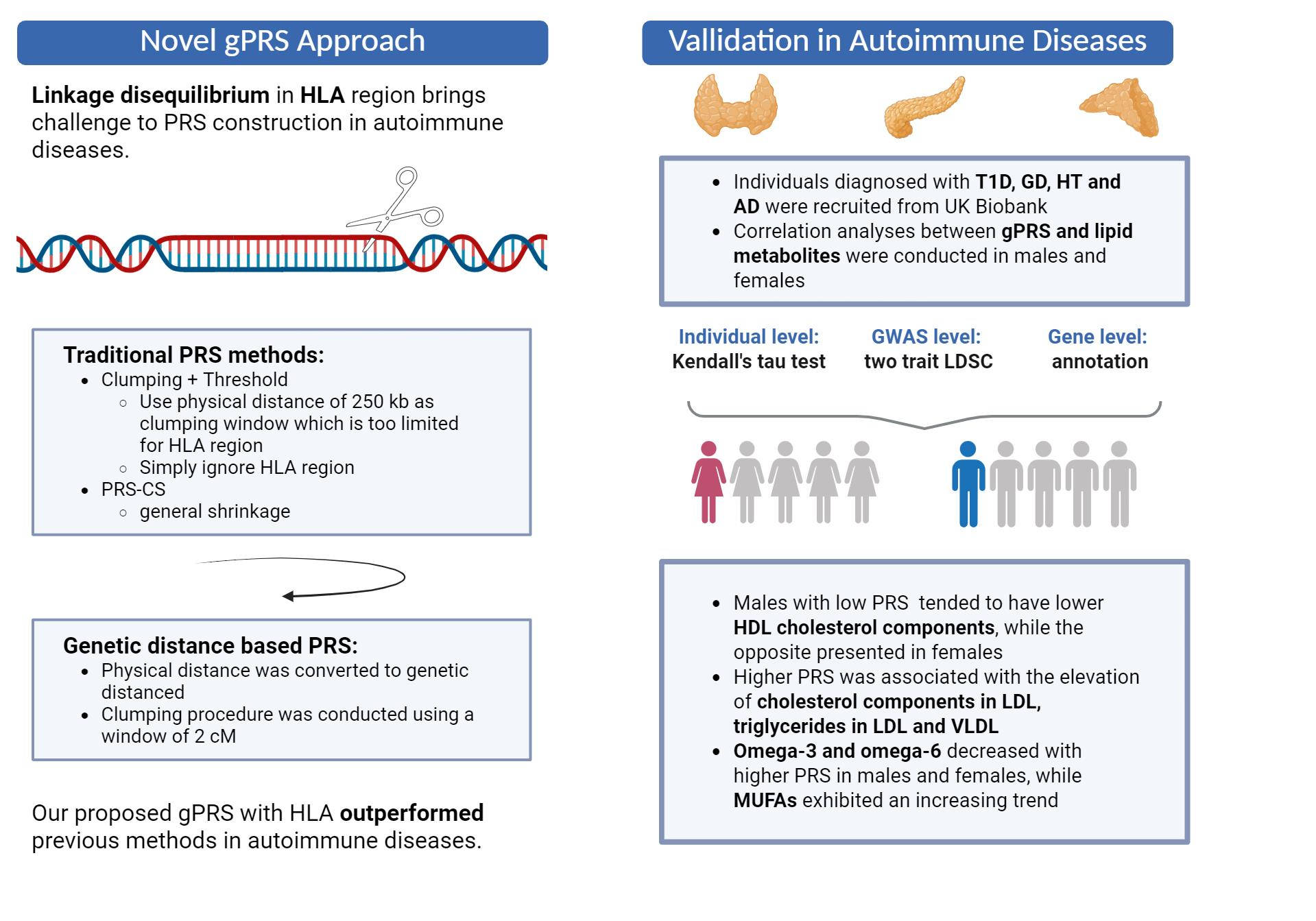 Genetic epidemiology has provided new approaches for association studies to explore the latent mechanism connecting genotype, endophenotype and phenotype [10]. Polygenic risk score (PRS) provides a quantitative genetic evaluation for individuals by summarizing weighted allele scores in an additive model [11]. However, the construction of PRS faces challenges in AIDs, as they are heavily influenced by the human leukocyte antigen (HLA) region [12], which is in high linkage disequilibrium (LD), and this strong correlation structure across the genome introduces bias into the estimation of independent effects. Traditional methods use a physical distance of 250 kb as a clumping window to extract independent and significant single-nucleotide polymorphisms (SNPs) [13]. This is limiting for the 8000 kb HLA region [14], since the use of such a narrow window can lead to loss of crucial information within the HLA region. Unfortunately, this issue has often been overlooked for autoimmune diseases. As the simple expansion of window size could lead to poor statistical power, some studies simply excluded the HLA region [15], while others avoid SNP selection and adjust effect sizes globally, utilizing methods such as PRS-CS [16]. To fully leverage original genome-wide association studies (GWAS) and address these limitations, our study introduces a novel approach that uses genetic distance, rather than physical distance [17] for clumping to preserve the integrity of the HLA region. This study will construct PRS models that account for the genetic architecture of endocrine AIDs to elucidate the role of immune and inflammatory biomarkers in lipid metabolism. By focusing on the multi-systemic and poly-glandular characteristics of endocrine AIDs, our study can further explore the common genetic architecture and metabolic patterns across traits, providing a deeper understanding of the underlying pathology.