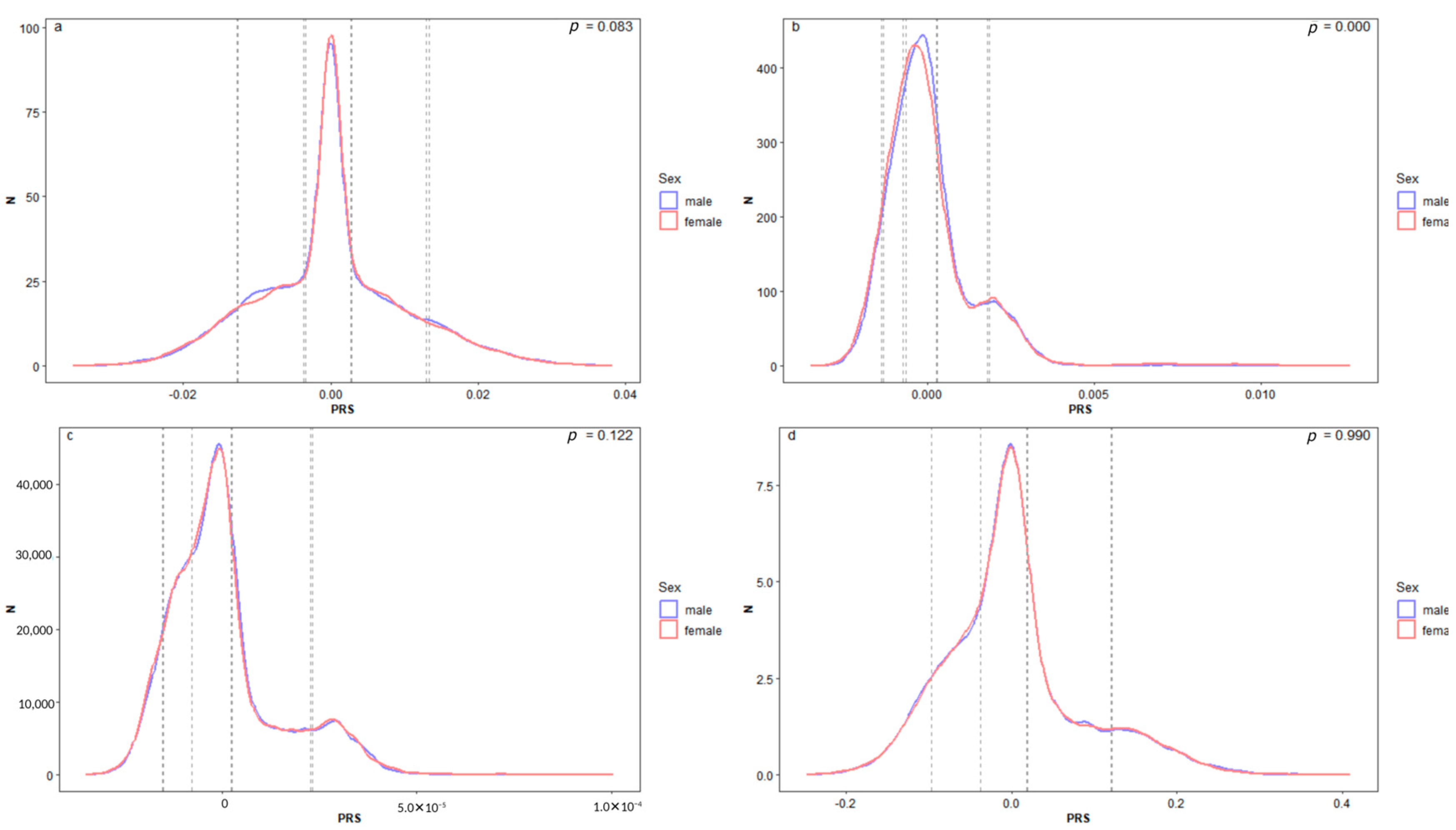Figure 1. Sex stratified distribution of PRS. It presents the gPRS distribution for two sexes across T1D (a), GD (b), HT (c), and AD (d). The solid blue and red lines delineate the distribution for males and females, respectively. The dashed lines indicate the boundaries for the top 10%, the high 20%, the middle 20%, the low 30%, and the bottom 10% within each sex. The p-value of Kolmogorov–Smirnov test between sexes is shown in the top right.