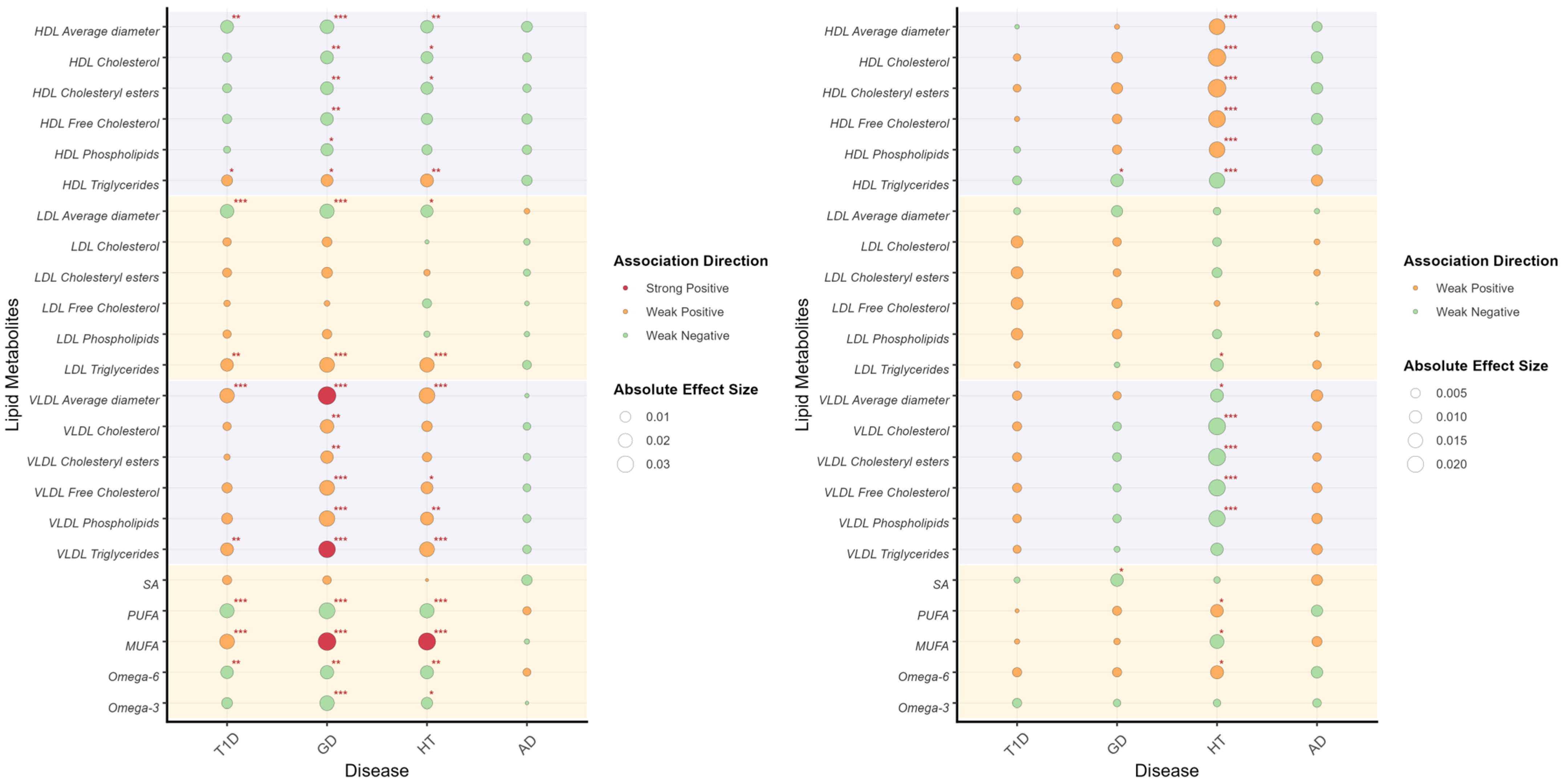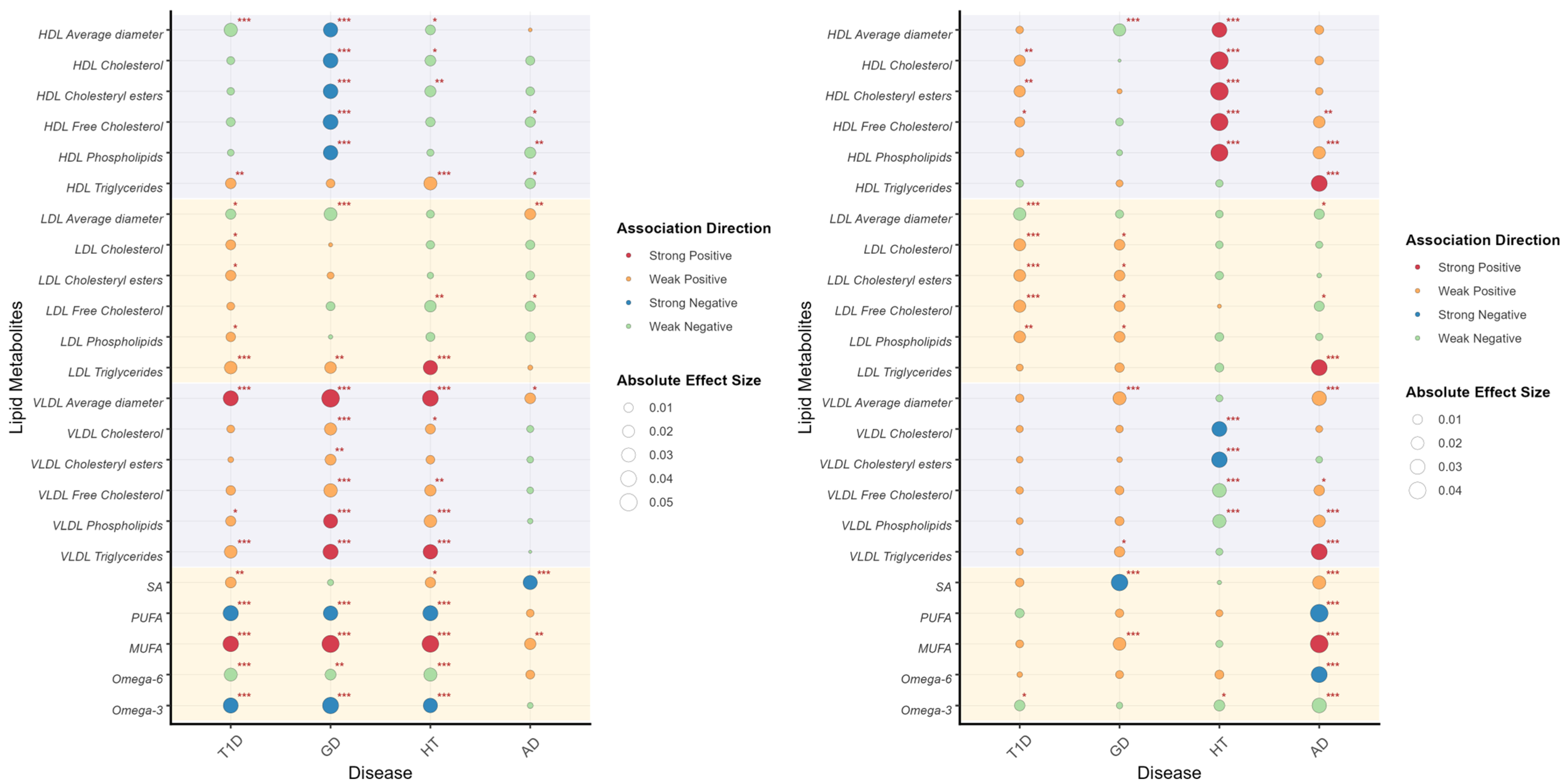 We assessed the relationship between genetic risk and lipid metabolite levels across T1D, GD, HT, and AD to identify metabolites that were either shared or specific to individual diseases (Figure 3). The majority of these associations exhibited the same direction in both sexes, though the magnitude and significance varied.