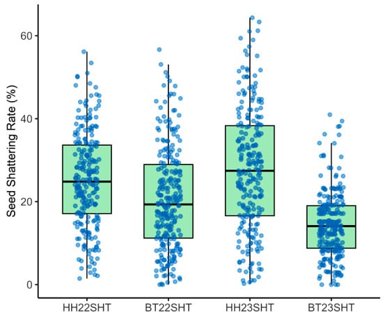 Boxplots of seed shattering rates. HH22SHT (Hohhot 2022), BT22SHT (Baotou 2022), HH23SHT (Hohhot 2023), BT23SHT (Baotou 2023).
