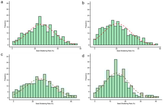 Histogram of seed shattering rates. (a) HH22SHT (Hohhot 2022), (b) BT22SHT (Baotou 2022), (c) HH23SHT (Hohhot 2023), (d) BT23SHT (Baotou 2023). The red dashed line represents the fitted normal distribution curve based on the sample mean and standard deviation.
