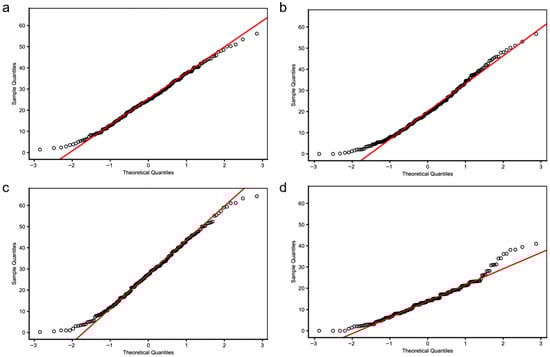 To investigate the environmental effects on seed shattering, we analyzed seed shattering rates across four environment-year combinations: HH22SHT (Hohhot 2022), BT22SHT (Baotou 2022), HH23SHT (Hohhot 2023), and BT23SHT (Baotou 2023). Figure 1 shows the boxplots of seed shattering rates across the four environments. The mean seed shattering rates were 25.21%, 20.70%, 27.76%, and 14.37% for HH22SHT, BT22SHT, HH23SHT, and BT23SHT, respectively. HH22SHT and HH23SHT exhibited broader phenotypic ranges (0–56.15% and 0–64.35%), indicating greater variability, while BT23SHT showed a narrower range (0–40.98%). Figure 2 presents frequency histograms with overlaid normal distribution curves. The distributions of HH22SHT (Figure 2a) and HH23SHT (Figure 2c) were approximately symmetric, suggesting near-normality, while BT22SHT (Figure 2b) and BT23SHT (Figure 2d) were right-skewed, indicating deviations from normality. This suggests that environmental factors in Baotou may have constrained shattering trait variation. Figure 3 shows Q-Q plots for normality assessment. Data from HH22SHT and HH23SHT closely followed the theoretical quantile line, supporting normality, while BT22SHT and BT23SHT showed clear tail deviations, confirming non-normality in these datasets.