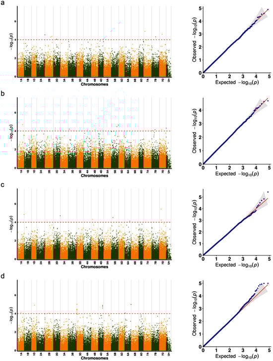 Manhattan and Q-Q plots of genome-wide association results for seed shattering under four environments. Each subfigure (a–d) represents a specific environment: (a) HH22SHT (Hohhot 2022), (b) BT22SHT (Baotou 2022), (c) HH23SHT (Hohhot 2023), and (d) BT23SHT (Baotou 2023). Manhattan plots are shown on the left and Q-Q plots on the right. The red dashed line represents the significance threshold (−log10(p) = 4).