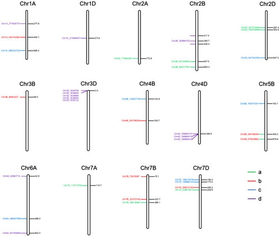 Distribution of 36 significant SNPs associated with the seed shattering trait across 14 wheat chromosomes. Panels (a–d) correspond to the four environment-year combinations: (a) HH22SHT (Hohhot 2022), (b) BT22SHT (Baotou 2022), (c) HH23SHT (Hohhot 2023), (d) BT23SHT (Baotou 2023).