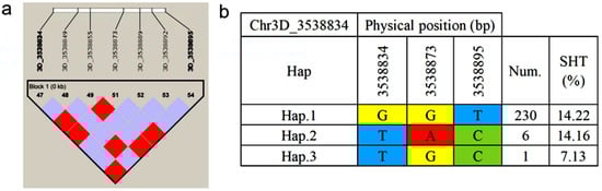 Haplotype analysis of all associated loci for seed shattering traits in P. juncea was performed using HaploView software (version 4.2). Results revealed that the SNP locus Chr3D_3538834 formed a 0 kb linkage region with six markers (Figure 6a). Within this region, three haplotypes were identified (Figure 6b): haplotype-GGT (Hap.1), haplotype-TAC (Hap.2), and haplotype-TGC (Hap.3). Among the 300 P. juncea individuals analyzed, 230 carried Hap.1 with an average seed shattering rate of 14.22%; 6 individuals carried Hap.2 with an average seed shattering rate of 14.16%; and 1 individual carried Hap.3 with the lowest seed shattering rate of 7.13%. These findings suggest that Hap.3 is a potentially superior haplotype for improving seed retention.