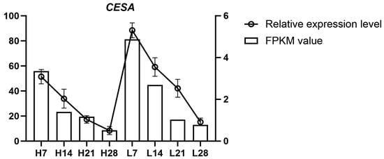 Expression analysis of the CESA gene in the abscission zone of Psathyrostachys juncea. L indicates low seed-shattering lines and H indicates high seed-shattering lines; numbers (7, 14, 21, 28) denote days after heading. Bars represent RNA-seq expression values (FPKM, left y-axis), and lines represent qRT-PCR relative expression levels (right y-axis). Dual y-axes display different measurement scales and are not directly comparable. Error bars indicate variation among biological replicates.