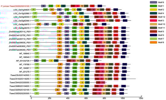 This study investigated the conservation and species-specific distribution patterns of CESA genes across different plants using motif analysis. The maximum number of motifs was set to 12, and MEME software was used to identify and analyze the distribution patterns of the motifs []. By comparing the motif distribution in P. juncea, T. aestivum, Z. mays, O. sativa, and A. thaliana, the study further explored the conservation of motif structures and the functional differences between species.