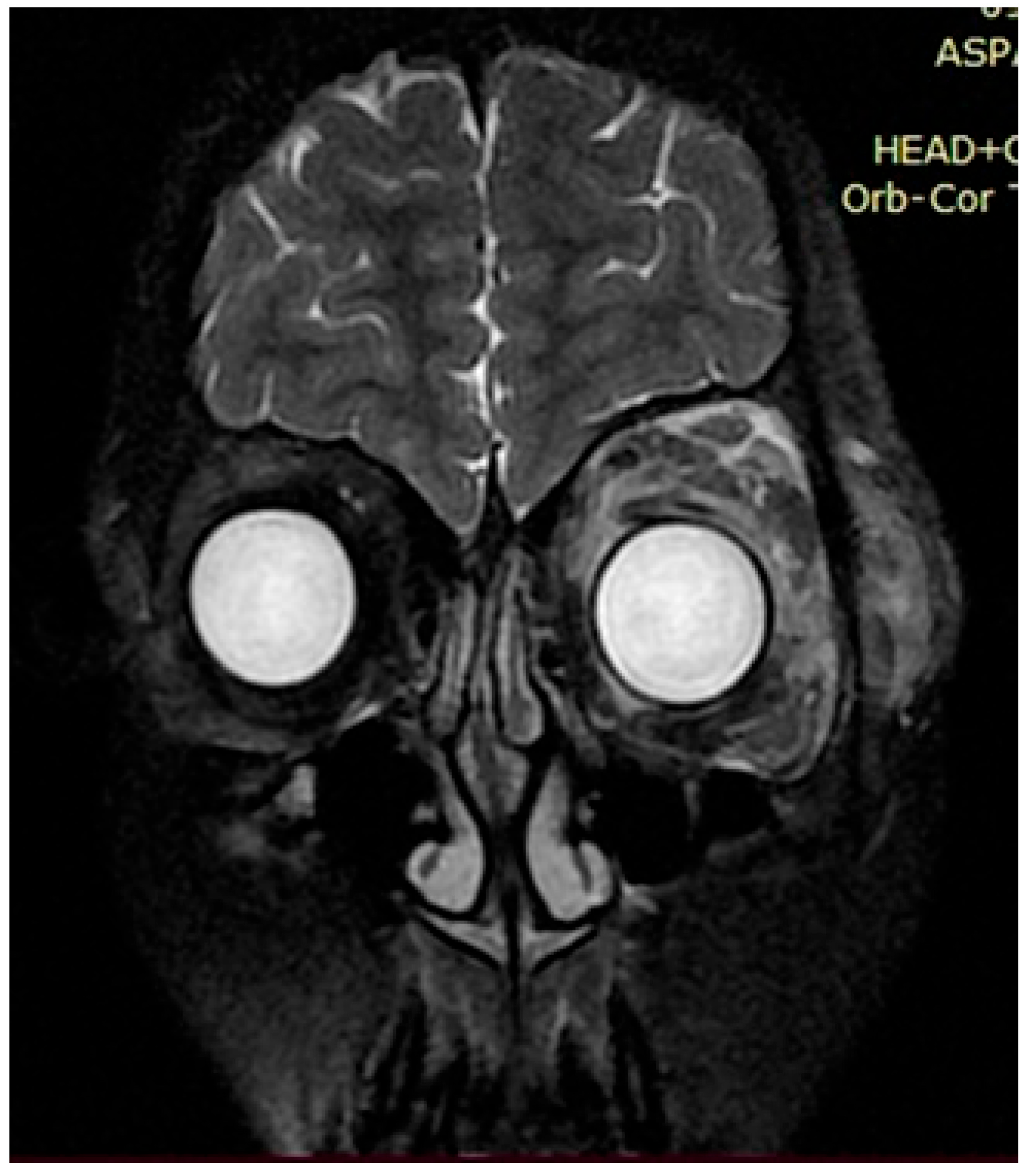 Figure 5. Case 3, clinical diagnosis of a 6-year-old girl 6: neurofibromatosis type 1, plexiform neurofibroma at the level of the right greater wing of the sphenoid bone with dysplasia, narrowing of the right retrobulbar space, with compression of the right optic nerve (over a length of 1.0 cm) and the superior and lateral rectus muscles of the right eye. NF1 gene genotyping: Chr17: 29576060 NM_001042492.2:c.4033A>T p.Lys1345Ter.