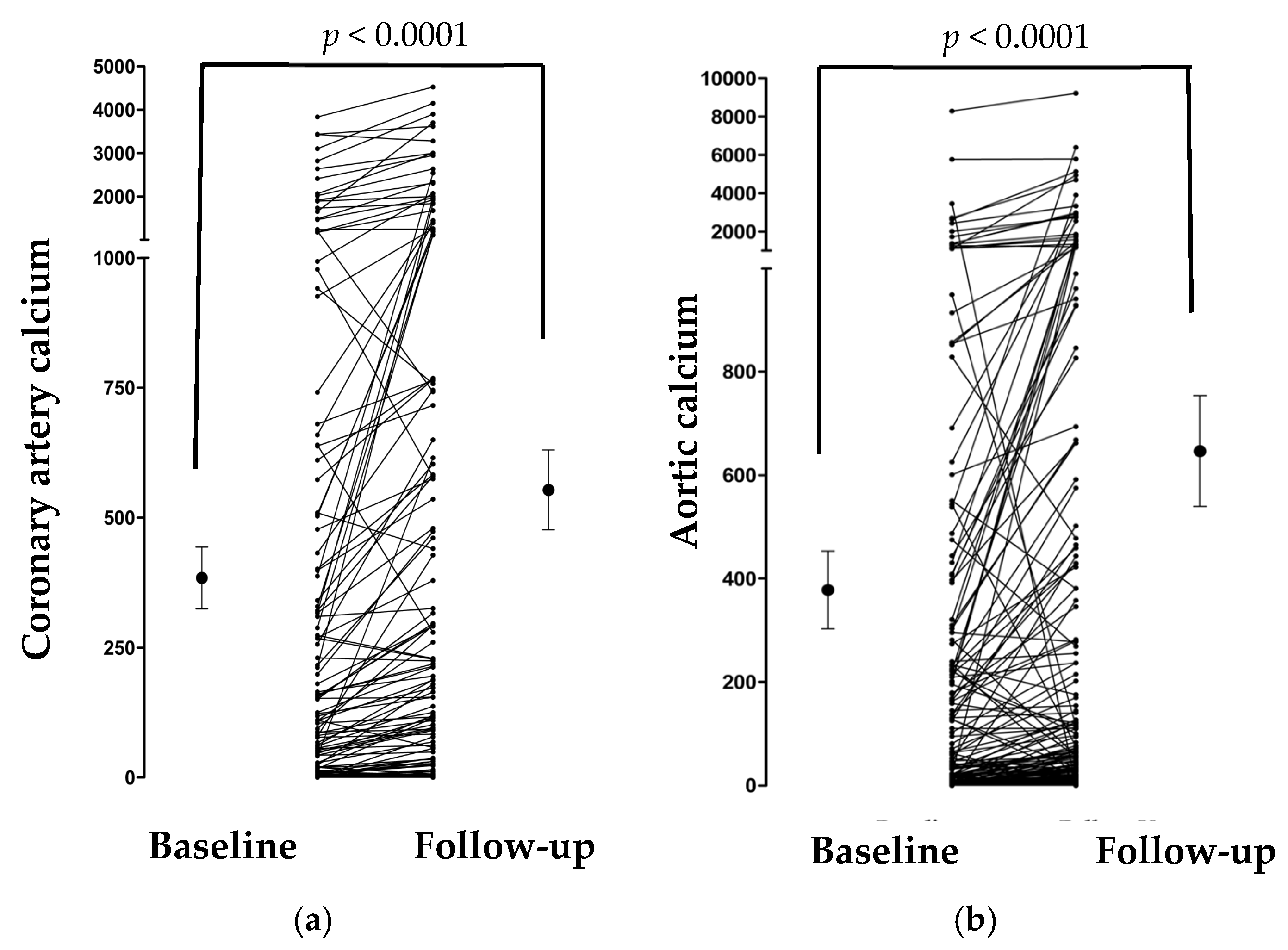 | Aortic calcification score (follow-up, n = 162) | 95.6 (25.4–661.6) |