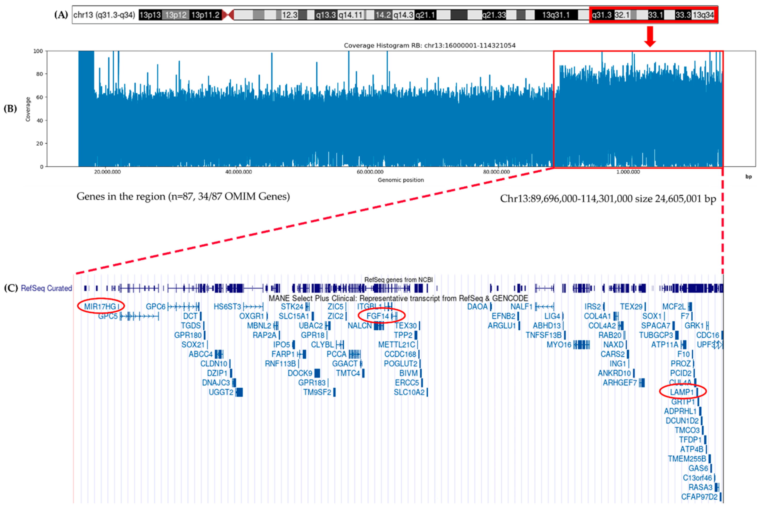 - Ioan, D.M.; Vermeesch, J.; Fryns, J.P. Terminal distal 13q trisomy due to de novo dup(13)(q32→qter). Genet. Couns. 2005, 16, 435–436. Available online: https://pubmed.ncbi.nlm.nih.gov/16440891/ (accessed on 18 November 2025).