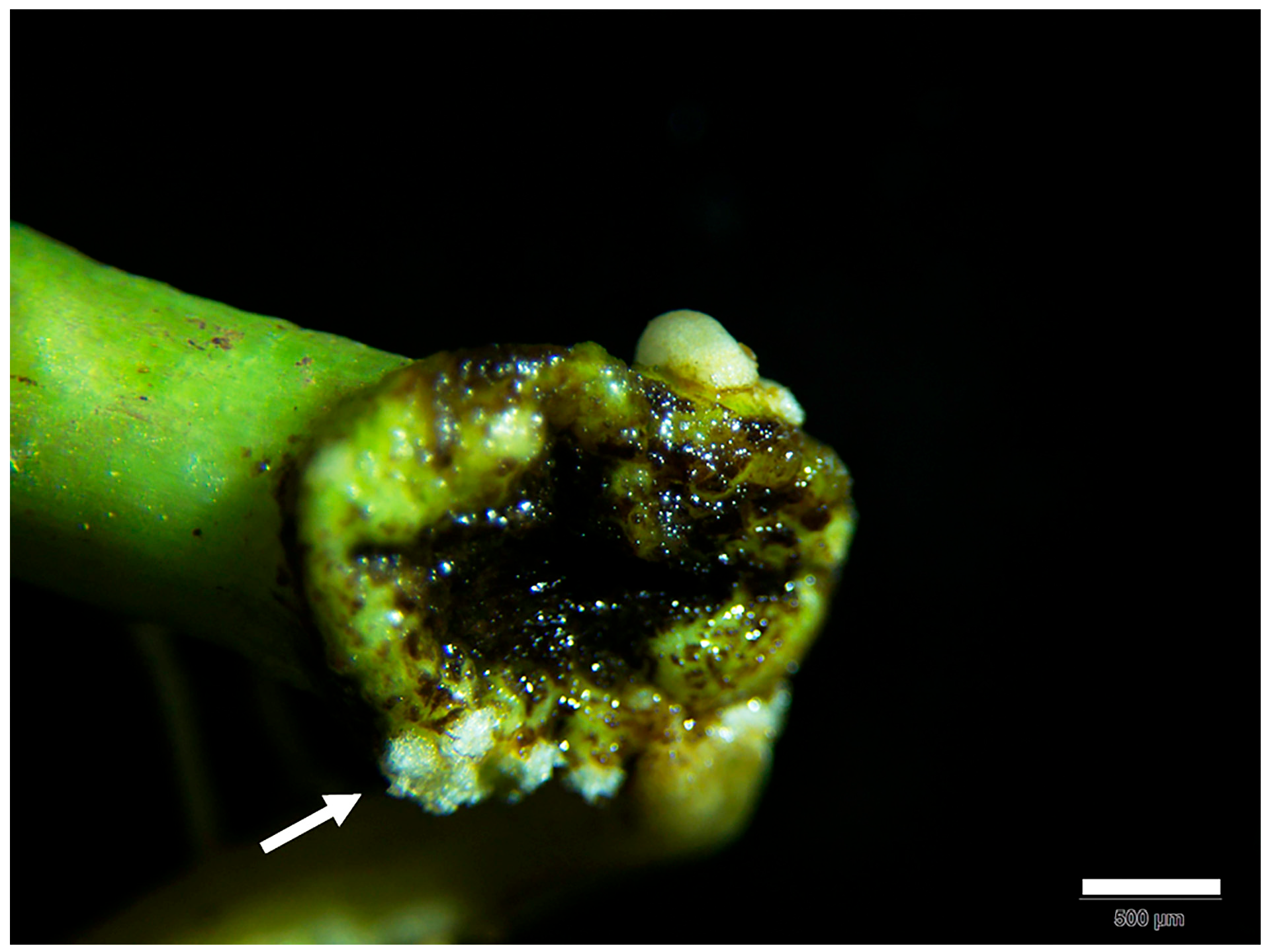- Guimaraes, L.A.; Pereira, B.M.; Araujo, A.C.G.; Guimaraes, P.M.; Brasileiro, A.C.M. Ex vitro hairy root induction in detached peanut leaves for plant-nematode interaction studies. Plant Methods 2017, 13, 25. [Google Scholar] [PubMed]