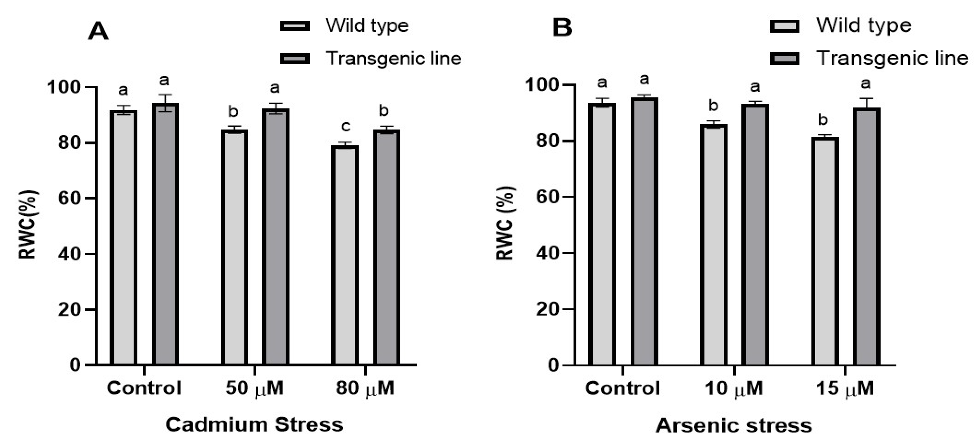 3.2. Transgenic Plants Retain Higher Relative Water Content in the Leaf Tissue Under Cd and as Stress