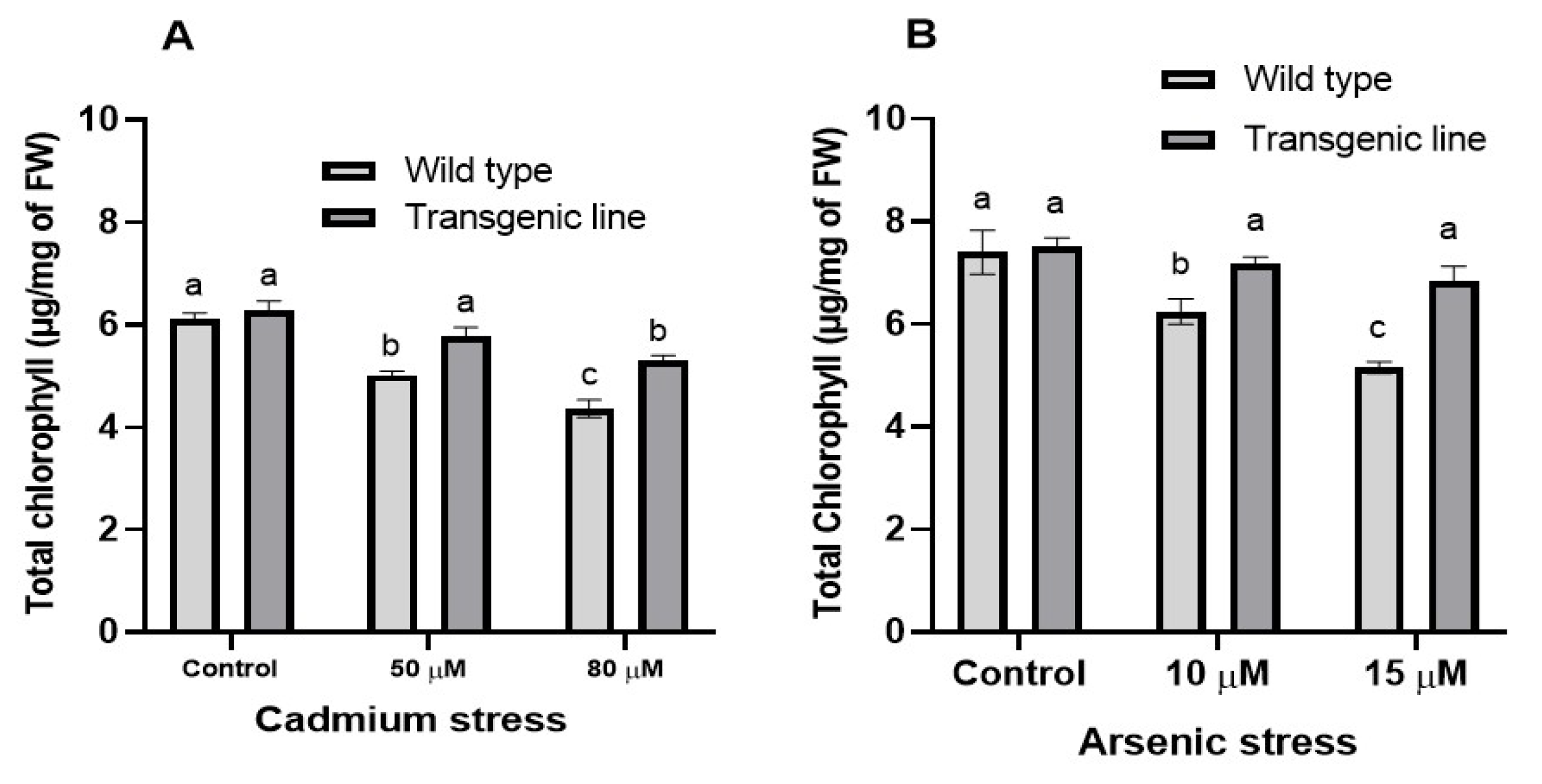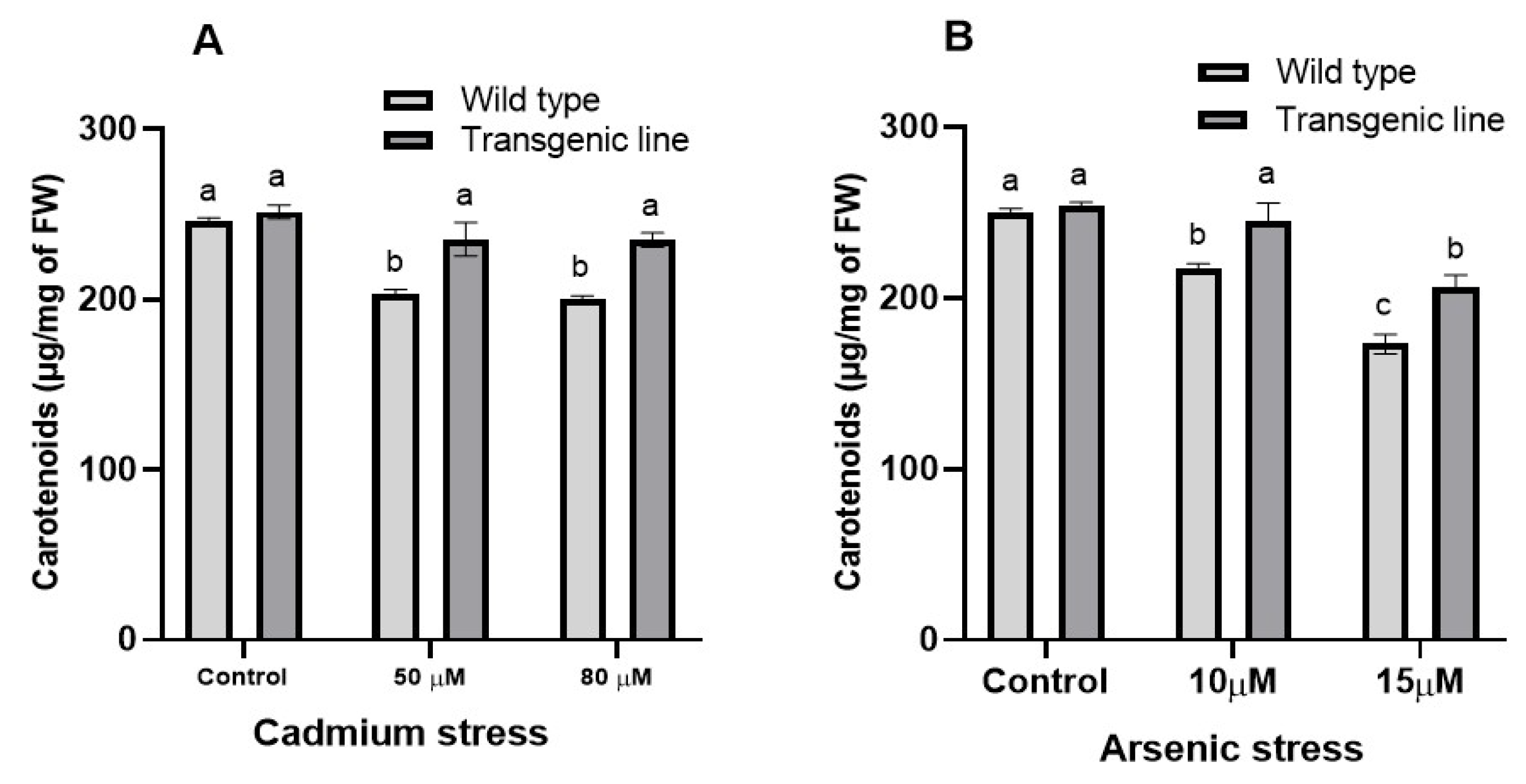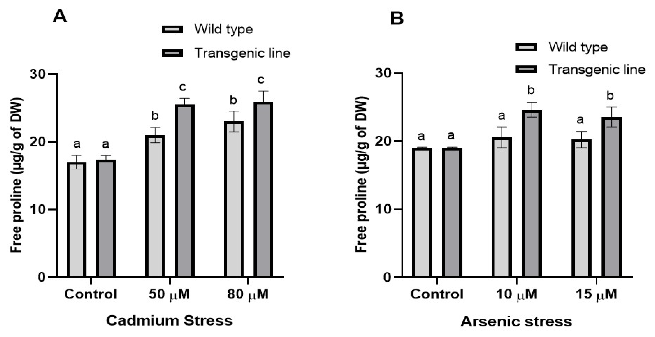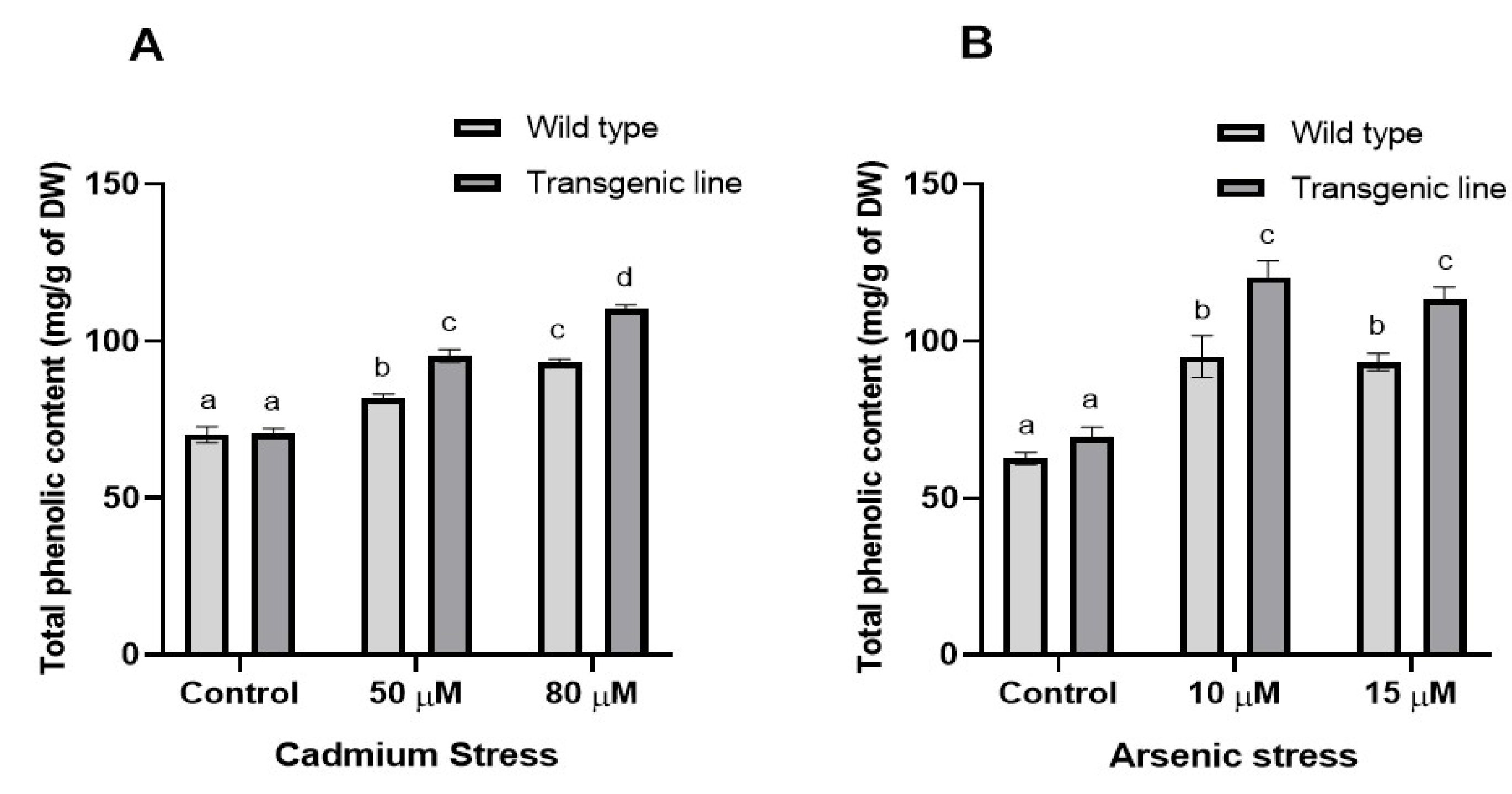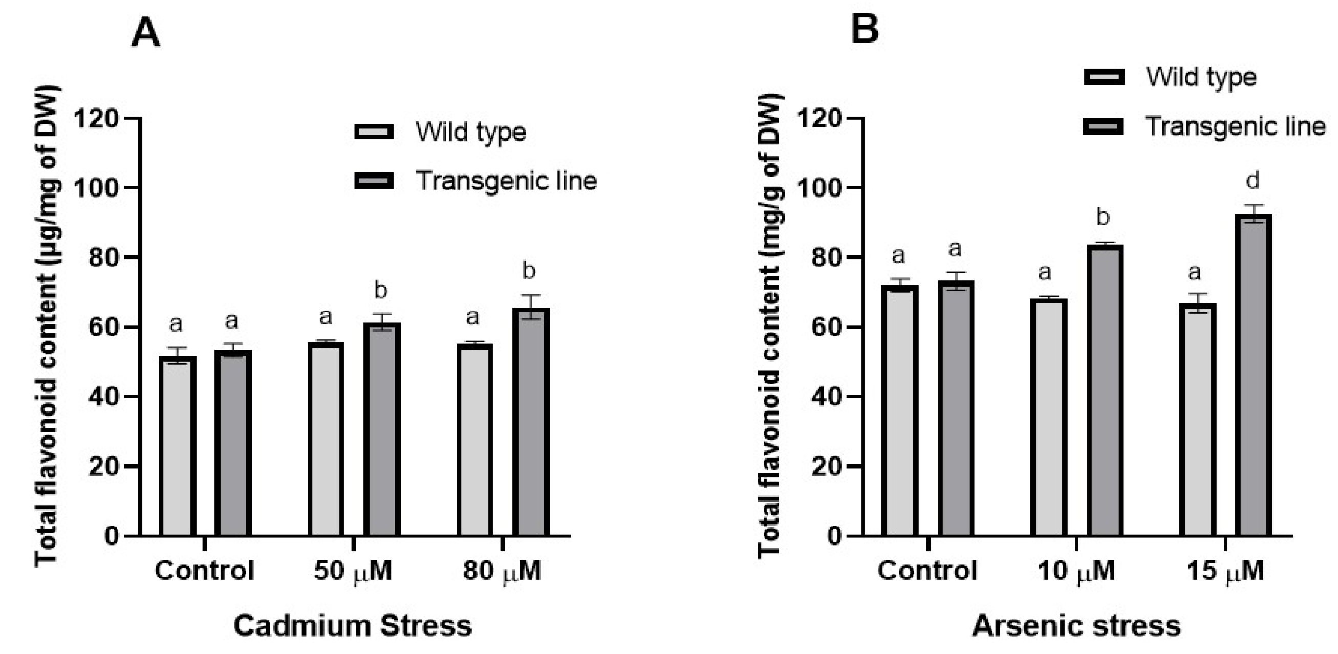 3.3. Transgenic Plants Accumulate More Proline, Phenolic and Flavonoid Content Under Cd and as Stress