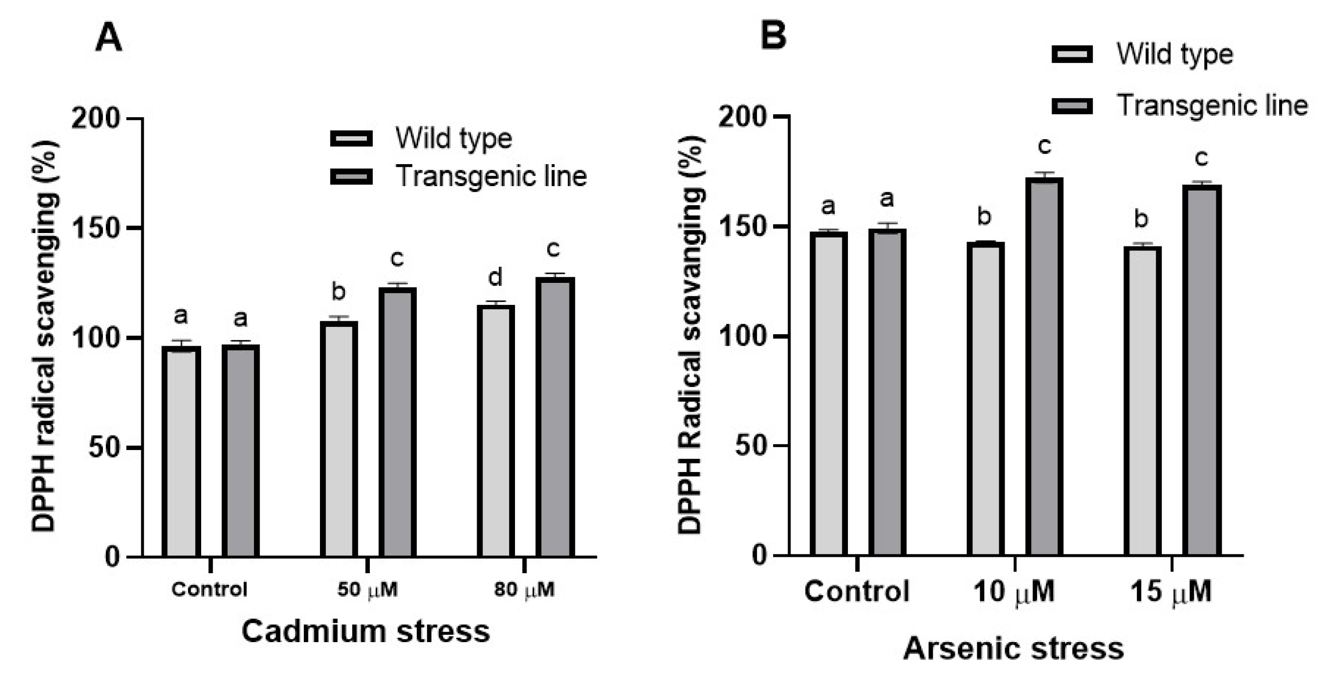 3.4. DPPH Free Radical Scavenging Activity Increases in Transgenic Line upon Cd and as Stress