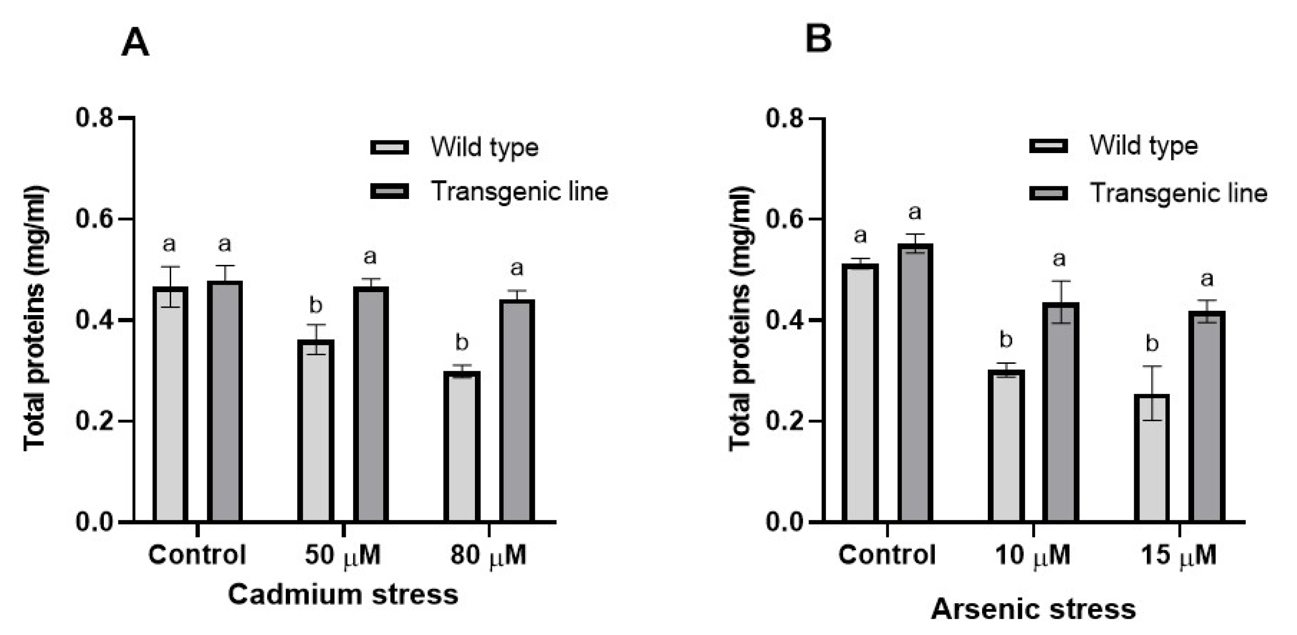 3.6. Effects on Total Protein Content Under Cd and as Stress